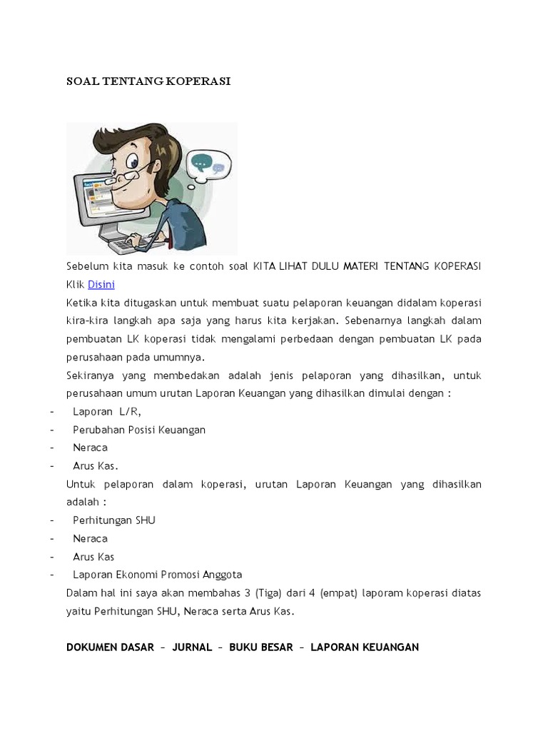 Soal Tentang Koperasi from imgv2-1-f.scribdassets.com Inilah pembahasan lengkap terkait contoh soal akuntansi koperasi simpan pinjam dan jawabannya. Kumpulan soal+jawaban akuntansi koperasi tugas 1 a. Contoh soal transaksi koperasi simpan pinjam transaksi (a) pada awal tahun 2008, sekelompok warga mendirikan koperasi dengan jumlah 250 orang. Contoh soal akuntansi keuangan menengah (1) contoh soal diterima/ditolaknya suatu investasi suatu proyek (1) contoh soal menghitung modal kerja dng menggunakan 3 konsep (1) contoh surat penawaran harga dan surat konfirmasi pembayaran (order) (1) contoh transaksi dan translasi mata uang asing (1) pembagian dividen property » berdasarkan. October 17, 2011 sojoro 1 comment. Demikian latihan soal tentang koperasi dan. Tanggal 2 februari 2010 koperasi xyz membeli barang dagang kepada toko m secara tunai rp 17 850 000. Contoh soal akuntansi koperasi simpan pinjam makalah public relation